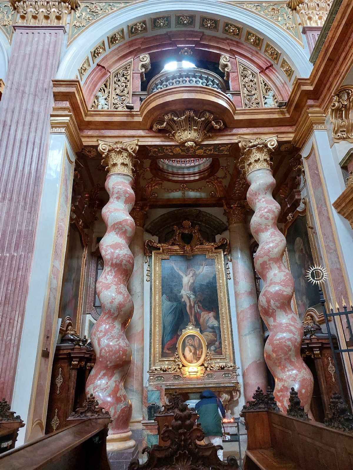 This simplicity however conceals a grandiose Baroque interior of marble pillars, intricate wooden carvings, soothing pink colors and dome-like ceiling which can only be described as opulent. This is the church of the Society of Jesus in Vienna.